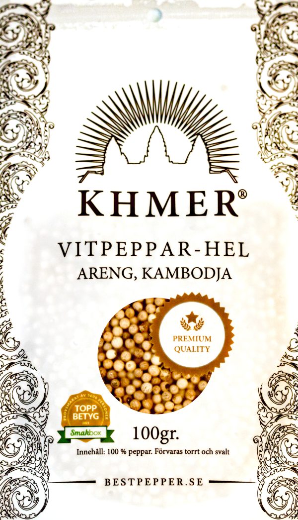 Vitpeppar KHMER är fräsch och härlig krydda som passar bra till fisk och fågel gärna i kombination med den röda. Äkta Vitpeppar är kärnan av Rödpeppar alt. svartpeppar. Vi använder endast vatten för att ta fram kärnan vilket förklarar den fräscha smaken och aromen på Vitpeppar KHMER