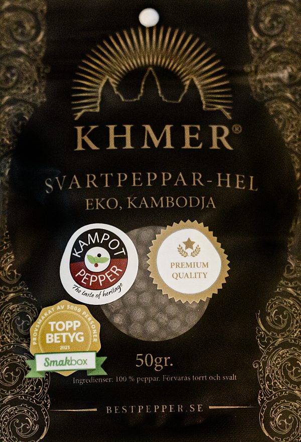 Svartpeppar KHMER handplockas under perioden Maj-Juni i de 4 meter höga pepparbuskarna varefter den gröna pepparn torkas i 3-4 dagar i solen till härlig svartpeppar. Pepparns smak är intensivt kryddig och passar till de flesta rätter.