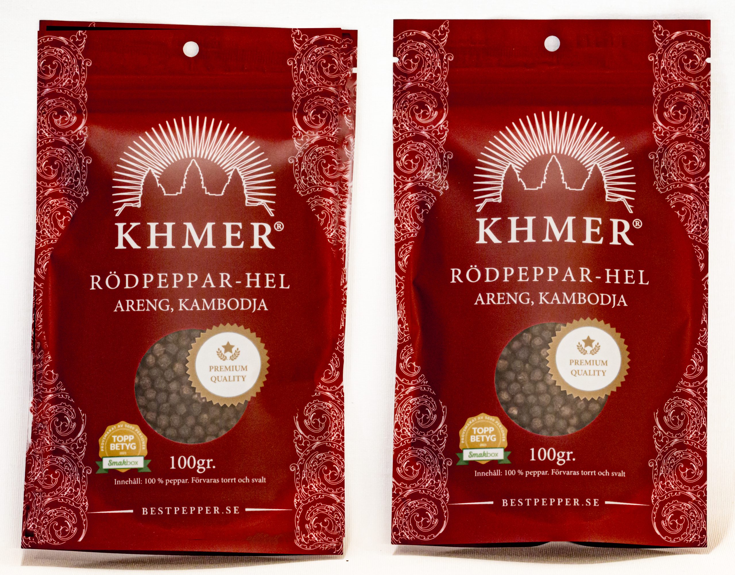 Smaken och Aromen är gudomlig. Den når inte samma styrka som Svartpepparns topp men kommer med en mycket angenäm smak som håller i sig länge. Rödpeppar KHMER passar till nästan all matlagning såsom kött, vilt, fläsk, kyckling, fisk, pasta, gratänger m.m.