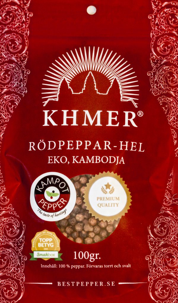 Rödpeppar Khmer Kampot är en EKO-odlad smakrik peppar från Kampot i Kambodja med en härlig eftersmak med toner av citrus.